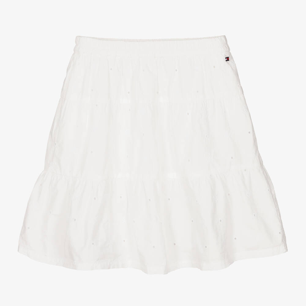 Lovely white skirt for girls by Tommy Hilfiger, made in smooth cotton poplin. It is patterned with tonal monogram logos for a subtle designer touch and has intricate cut-out detailing for an alternative finish. Easy to pull on, it has an elasticated waist and is half lined for added comfort and modesty. The outer material of this product is made with at least 95% organic cotton.