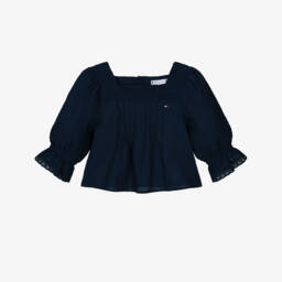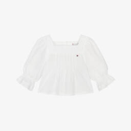 A lovely white cotton blouse for girls by Tommy Hilfiger, with a small embroidered flag logo on the chest. Cool and lightweight, this pretty style has a square neckline and pintuck detailing. It has puffed, three-quarter length sleeves, trimmed with delicate broderie anglaise for a sophisticated finish.