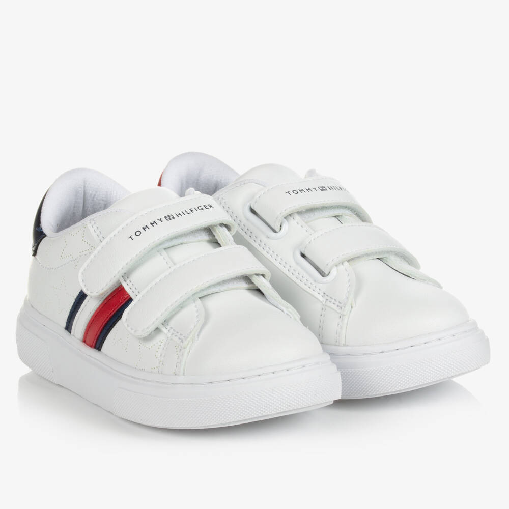 Girls white faux leather trainers from Tommy Hilfiger. They fasten with logo-printed velcro straps across the foot for a secure and supportive fit. For a further designer touch, the uppers have the brand's signature blue, red, and white stripes on the sides with subtle dotted stars for a pretty finish. The heels are lightly padded and trimmed with shiny red and blue panels. Designed for comfort, the inner soles are cushioned and the non-slip rubber outer soles improve grip underfoot. The polyester in these trainers is at least 50% recycled.
