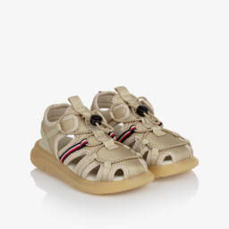 Beautiful white and gold leather sandals for girls by Tommy Hilfiger. Designed with a buckle-fastening ankle strap, they have gold logo print on the foot strap, with glitter detail and shiny gold trim. They are comfortably lined in soft leather, with a lightly cushioned insole and a flexible, non-slip rubber outer sole.
