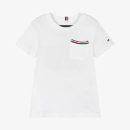 White jersey T-shirt for girls by American brand Tommy Hilfiger, made in a soft cotton blend. Elevating this casual wardrobe staple, the short sleeves have pretty curled trims. For a distinctive designer touch, the signature flag logo is embroidered on the chest and tricolour striped trim can be seen on the back of the crew neckline.