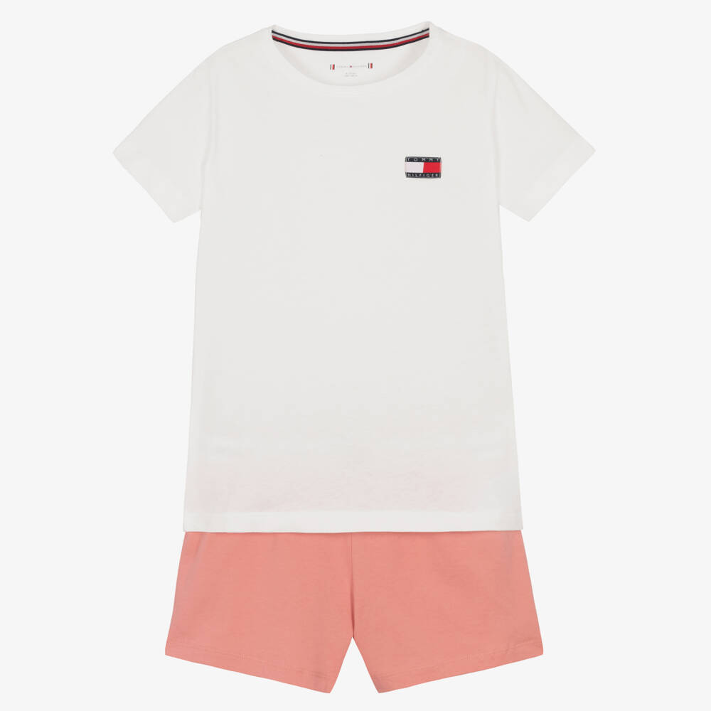 White and pink pyjamas for girls by American brand Tommy Hilfiger, made in soft cotton jersey. The white tee is embroidered with the signature flag logo on the chest, in signature navy blue, red and white colours. It pairs with pink stretchy shorts with a logo waistband, completing the stylish bedtime set.