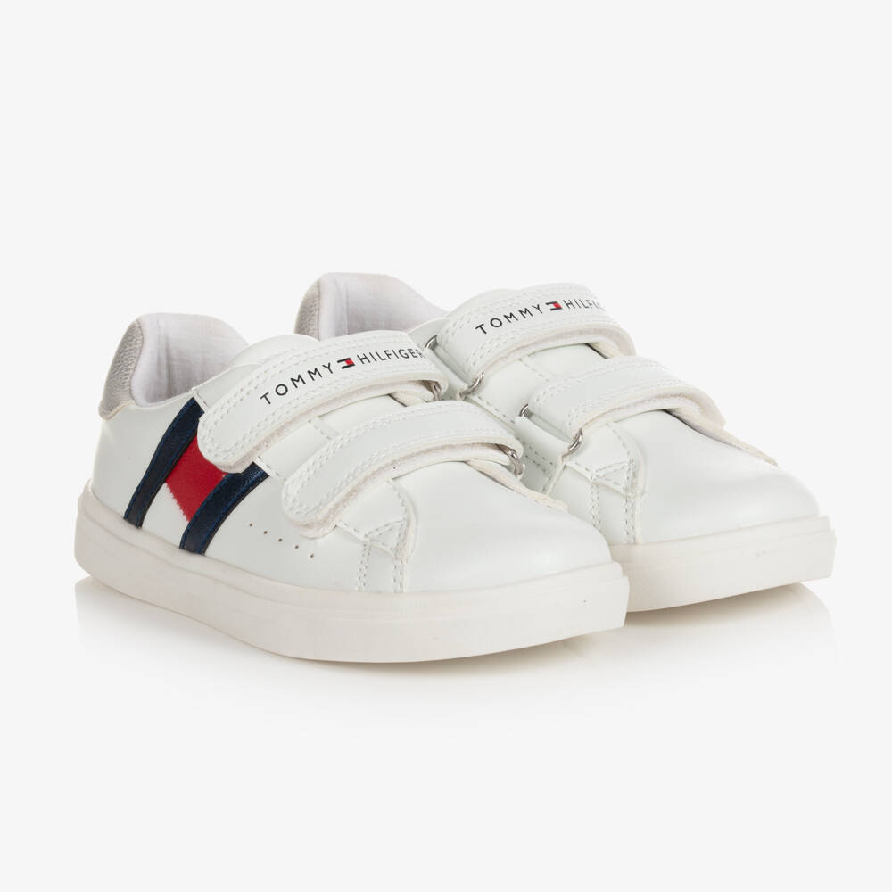 White low-top trainers for girls by Tommy Hilfiger, made in soft faux leather. Trimmed with touches of silver for a girly look, they have the signature flag logo on the sides in the classic red, blue and white colour scheme. The chunky rubber outer sole is embossed with the brand's logo and there is a logo print on the front velcro strap for an added logo look. This item contains at least 50% recycled polyester.