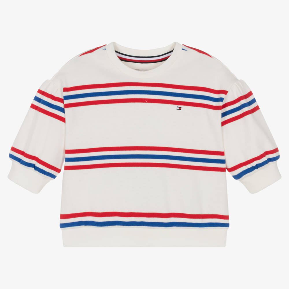 Striking off-white sweatshirt-style top for girls by Tommy Hilfiger, with vibrant varsity stripes in red and blue. Made in soft and lightweight organic cotton jersey, this relaxed top has dropped shoulders and short sleeves that finish at the elbow. A crew neck and ribbed trims complete the casual look. This product is made with at least 95% organic cotton.