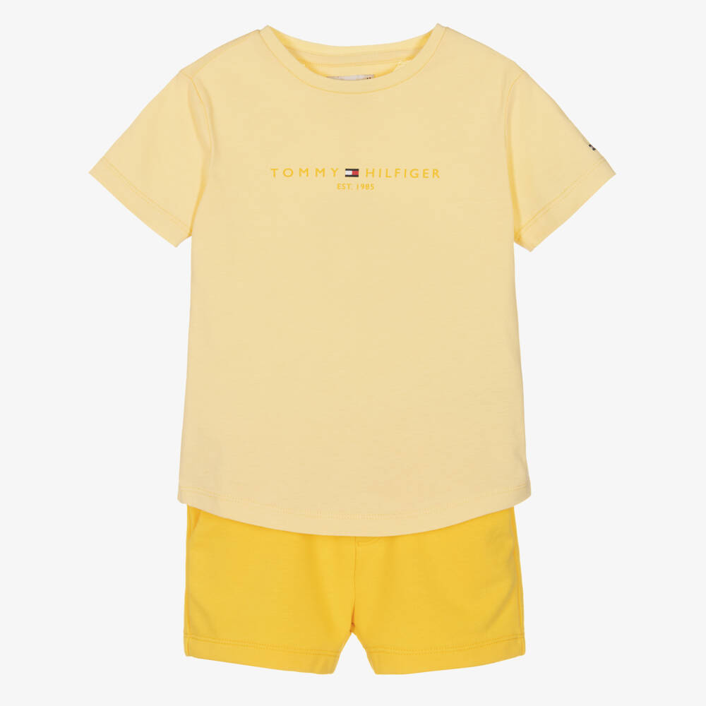 Sporty yellow cotton shorts set for girls by American brand Tommy Hilfiger, made in comfortable jersey for relaxed days. The pale yellow T-shirt has a contrasting yellow logo printed on the front, with the iconic embroidered flag logo on one sleeve. The dark yellow shorts have a ribbed waistband with a white drawstring for a good fit and useful, jetted side pockets. They have an embroidered flag logo on one side.