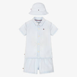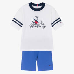 Sporty yellow cotton shorts set for girls by American brand Tommy Hilfiger, made in comfortable jersey for relaxed days. The pale yellow T-shirt has a contrasting yellow logo printed on the front, with the iconic embroidered flag logo on one sleeve. The dark yellow shorts have a ribbed waistband with a white drawstring for a good fit and useful, jetted side pockets. They have an embroidered flag logo on one side.