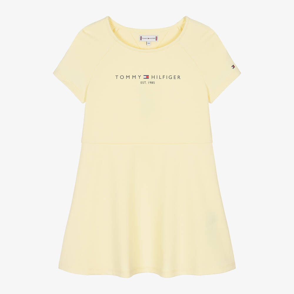 Muted yellow dress for girls by Tommy Hilfiger, made in a soft and stretchy jersey blend with recognisable branded touches. It has short raglan sleeves, a round neckline and a fit-and-flare silhouette for casual dressing. There is navy blue logo lettering on the front and an iconic flag motif embroidered on one sleeve.