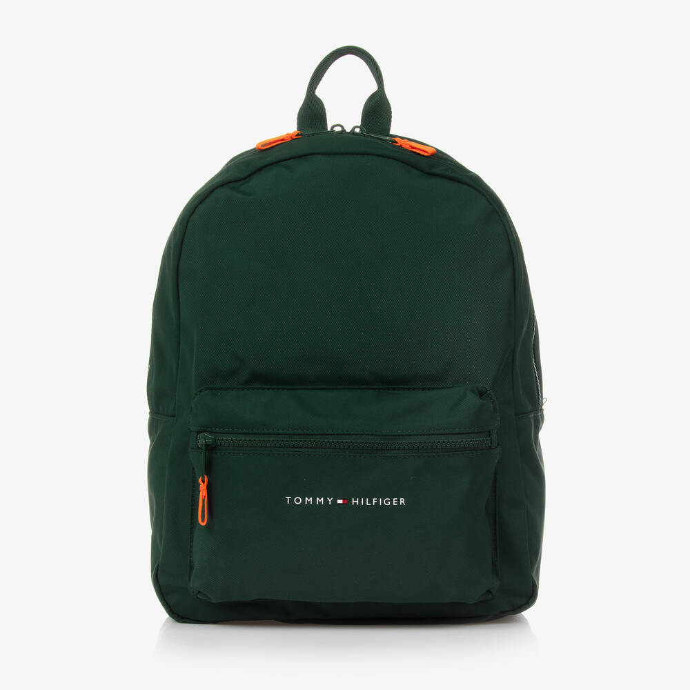 Dark green backpack for boys and girls by American brand Tommy Hilfiger, made in strong, durable canvas. Comfortable to wear, it has a padded back panel, adjustable, padded shoulder straps, connecting with an adjustable chest strap for extra support, and a useful carry handle on top. There is a zipped pocket on the front, with a white logo and the signature flag motif, and a large main compartment with an elasticated slip pocket. The outer material of this product is made with at least 95% recycled materials.