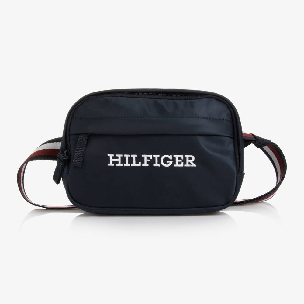 Navy blue belt bag for boys and girls by Tommy Hilfiger, made from silky smooth recycled fabric. Great for small essentials, this handy bag has a main compartment and exterior pocket, both securely fastened with zips. In the brand's signature colours, the webbed strap is fully adjustable and fastens with a buckle clip. A recognisable logo is embroidered across the front in white for an important finishing touch.