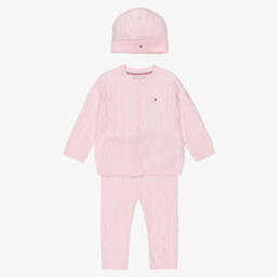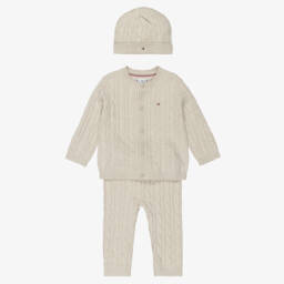 This lovely navy blue trouser set for baby boys and girls by Tommy Hilfiger, is finely knitted with a traditional cable knit pattern. Beautifully soft and comfortable to wear, it includes a cosy cardigan, trousers with a drawstring elasticated waistband and a matching hat to keep little heads warm. Each piece is embroidered with the brand's signature flag logo for a subtle designer finish.