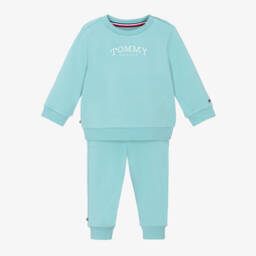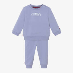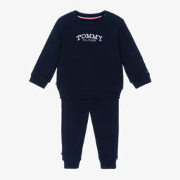Navy blue tracksuit for baby boys and girls by Tommy Hilfiger, made in cosy organic cotton jersey. Both pieces have embroidered logo detailing, including the brand's iconic flag. The top has poppers on one shoulder to help with dressing. The joggers have a gently elasticated waist adjustable with the signature striped drawstring.