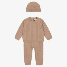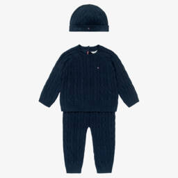 Cosy and comfortable for baby boys and girls, this navy blue trouser set is by Tommy Hilfiger. Knitted in a soft cotton blend, with a lovely cable pattern, it includes a button-fastening sweater, trousers with a gently elasticated waist, and a sweet beanie hat. The brand's iconic flag logo is embroidered on each piece for a signature finish.