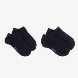 A pack of two navy blue cotton trainer socks for boys and girls by Tommy Hilfiger. Soft and stretchy for everyday wear, these socks have a signature flag logo on the heel.
