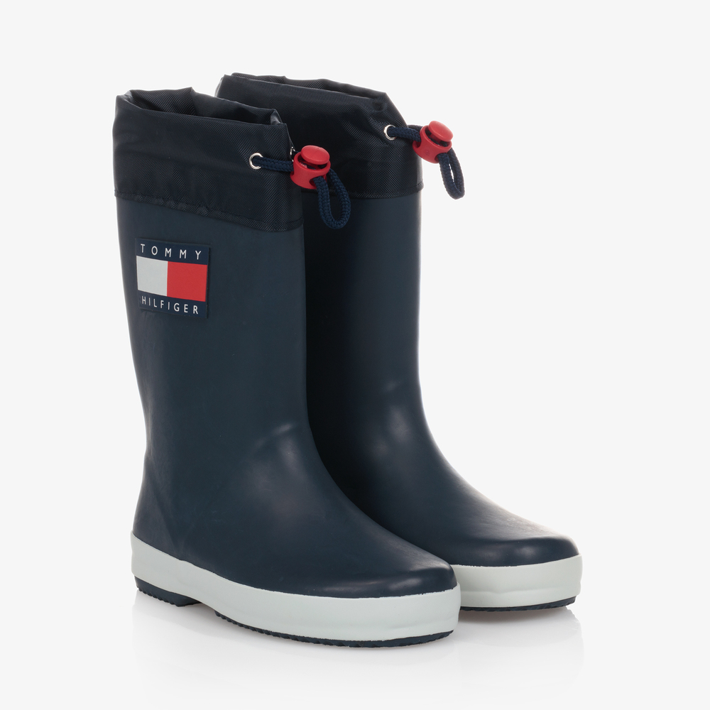 Navy blue rain boots for boys and girls by Tommy Hilfiger, with a rubberised flag logo on one side. They are lined in soft textile and have a non-slip rubber sole for improved grip. Waterproof and breathable, they have an adjustable toggle fastening around the top to keep rain out.