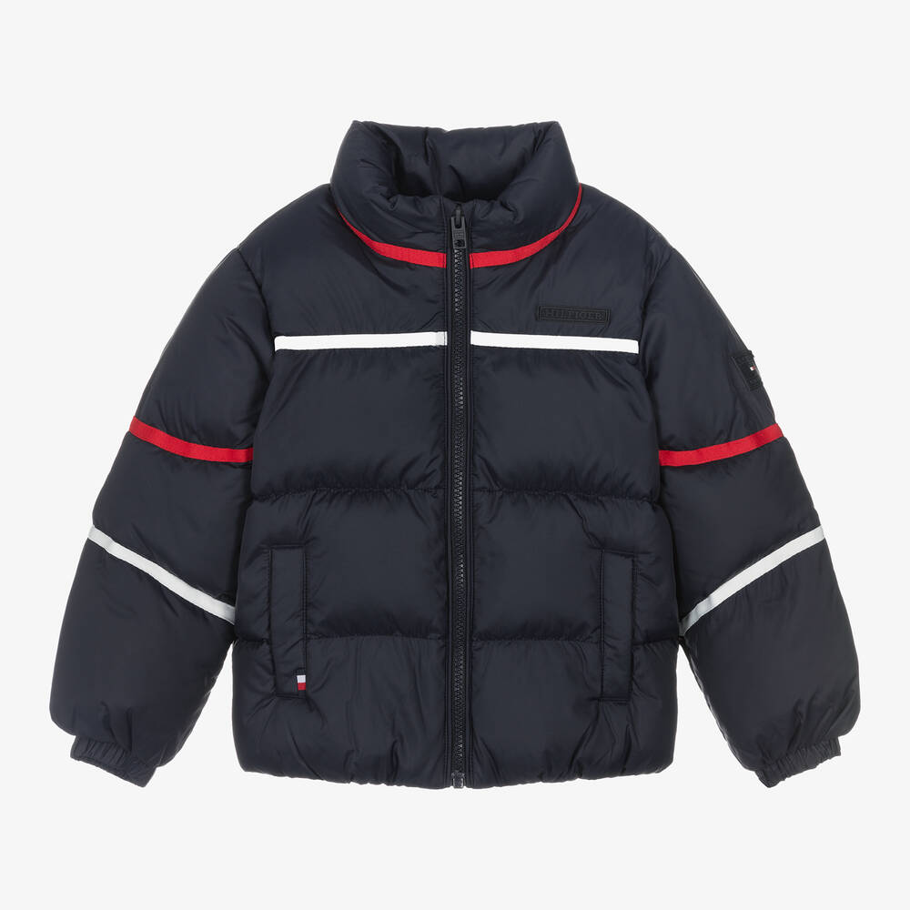 A navy blue puffer jacket for boys and girls by Tommy Hilfiger. Made in silky smooth recycled fabric, it features eye-catching stripe detailing in the American brand's signature colours and sporty rubberised logos for instant designer appeal. It is warmly padded and has a robust zip fastening. For added cosy wear, the sleeves have elasticated cuffs and the fleece-lined pockets secure with poppers. The outer material of this product is made with at least 95% recycled polyester.