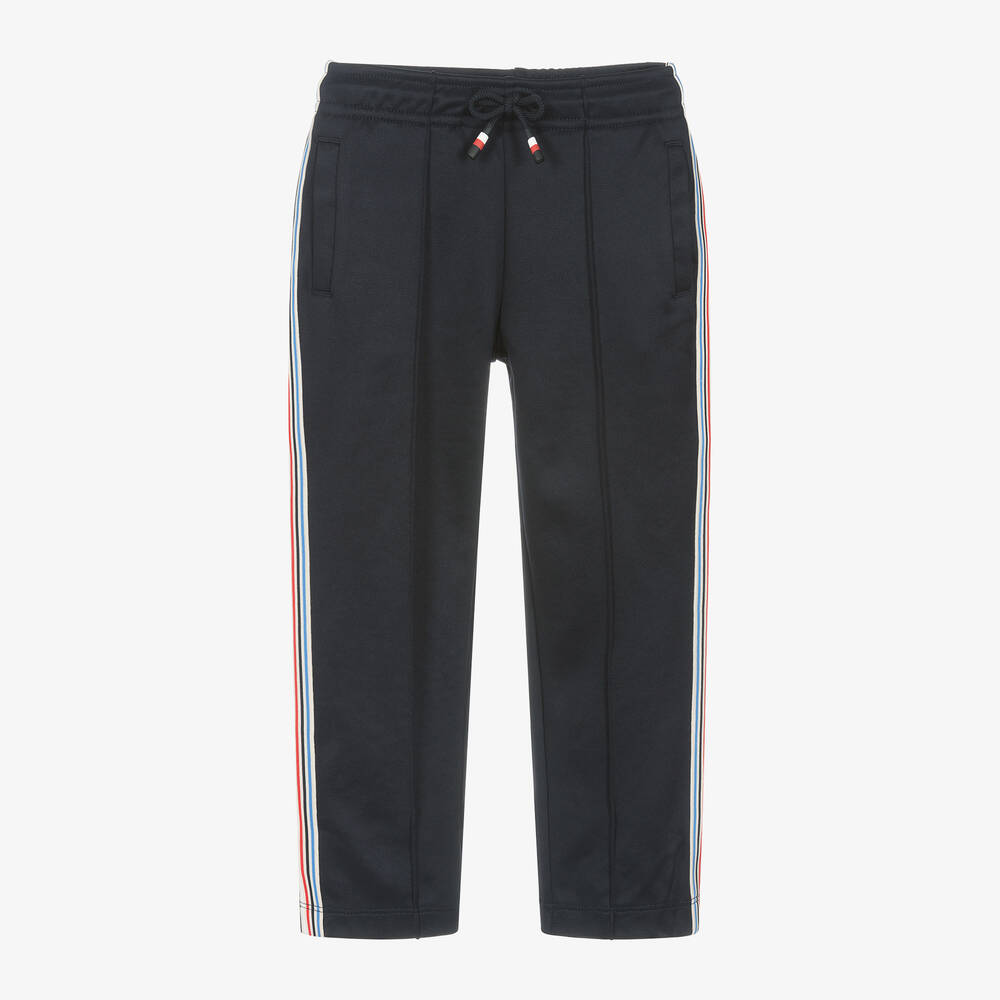 Navy blue straight-leg joggers for boys and girls by Tommy Hilfiger, made in a silky, stretchy jersey. This sporty style has ivory, red and blue taped trims down each leg and useful front pockets, with an embroidered flag logo above the back pocket. Comfortable to wear, they have an elasticated waistband with signature stripe detailing on the drawstring ties. This product is made with at least 95% recycled fabric.