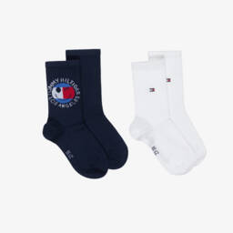 This pack of two ribbed socks for boys and girls by Tommy Hilfiger, has a navy blue pair with a cheerful smiley flag logo and a white pair with the brand's signature small flag logo. Made in a soft cotton blend, they have a comfortable, stretchy fit.