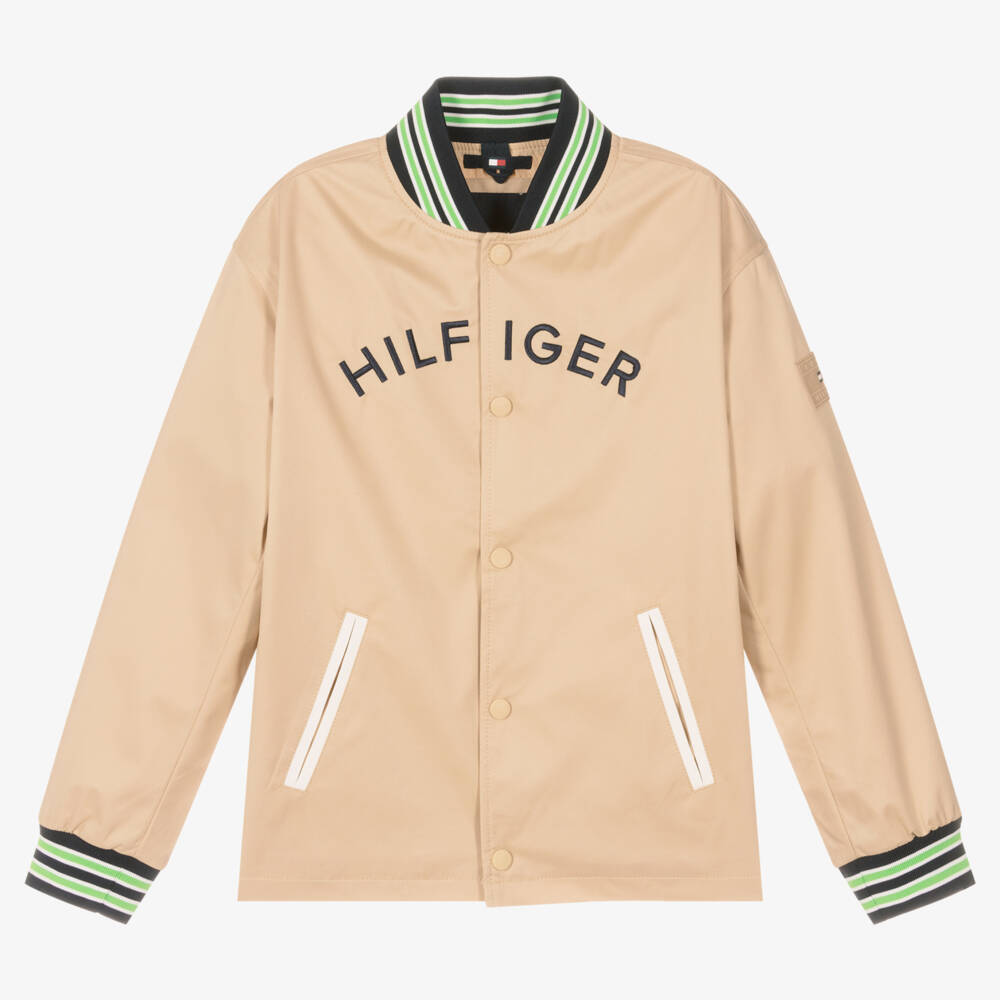 Cool smart-casual beige bomber jacket for teen boys by American brand Tommy Hilfiger. Made in lightweight twill with a slight sheen, it has a large black logo embroidered across the chest, a signature flag logo on one sleeve and logo popper fastenings on the front. There are black, green and white ribbed trims, and jetted front pockets trimmed in ivory. The jacket is fully lined in satin for comfort.