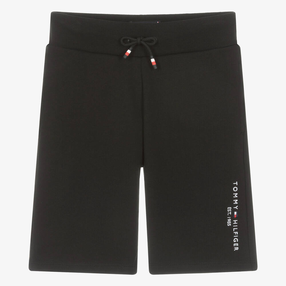 Black shorts for teen boys from American brand, Tommy Hilfiger. Instantly recognisable, they have an embroidered white logo on one leg, while the signature flag can be seen on the back. This casual, sporty style is made in mid-weight cotton jersey with concealed side seam pockets and another pocket around the back. The ribbed waistband has an adjustable drawstring tie, with branded end caps to complete the look.