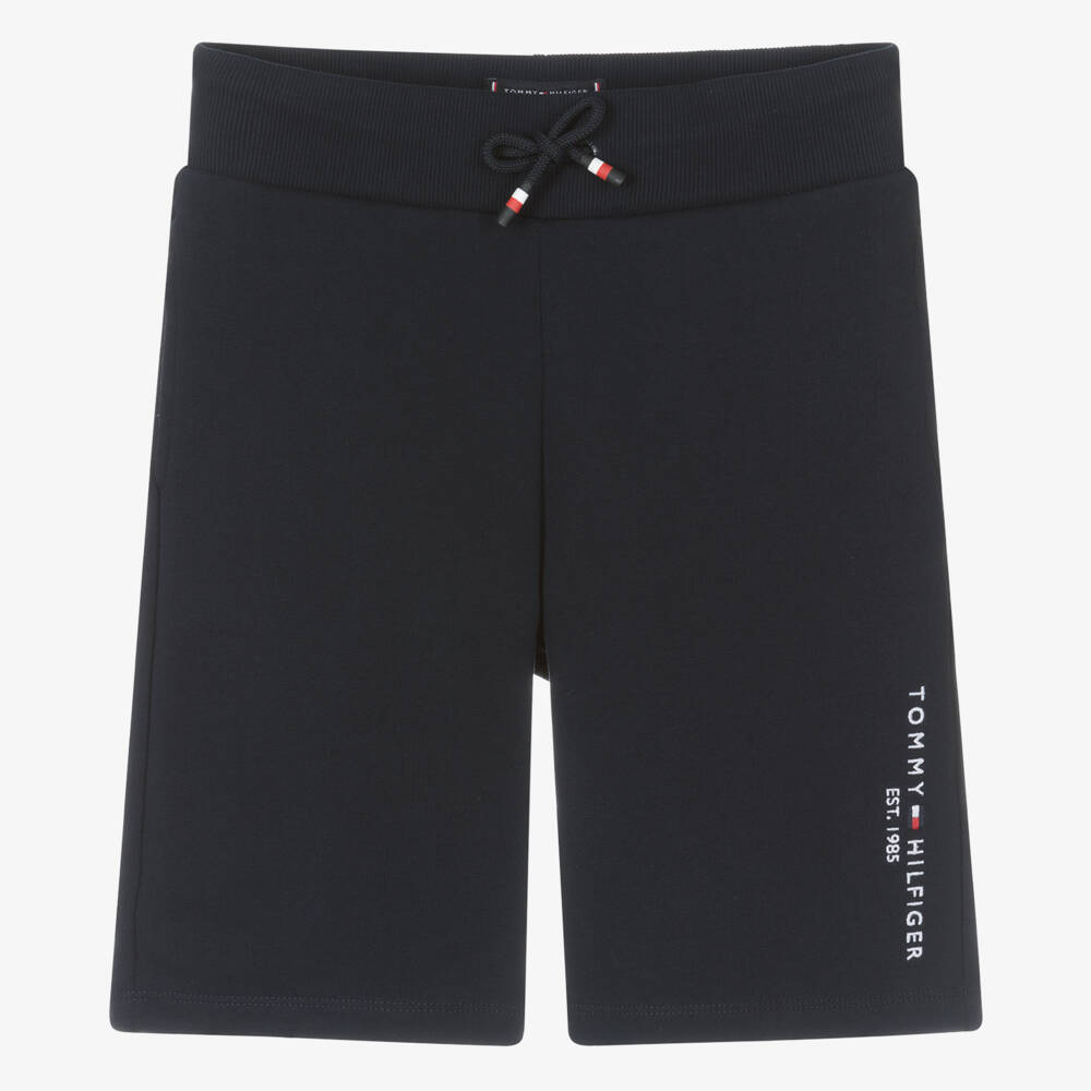 Navy blue shorts for teen boys from American brand, Tommy Hilfiger. Instantly recognisable, they have an embroidered navy blue logo on one leg, while the signature flag can be seen on the back. This casual, sporty style is made in mid-weight cotton jersey with concealed side seam pockets and another pocket around the back. The ribbed waistband has an adjustable drawstring tie, with branded end caps to complete the look.