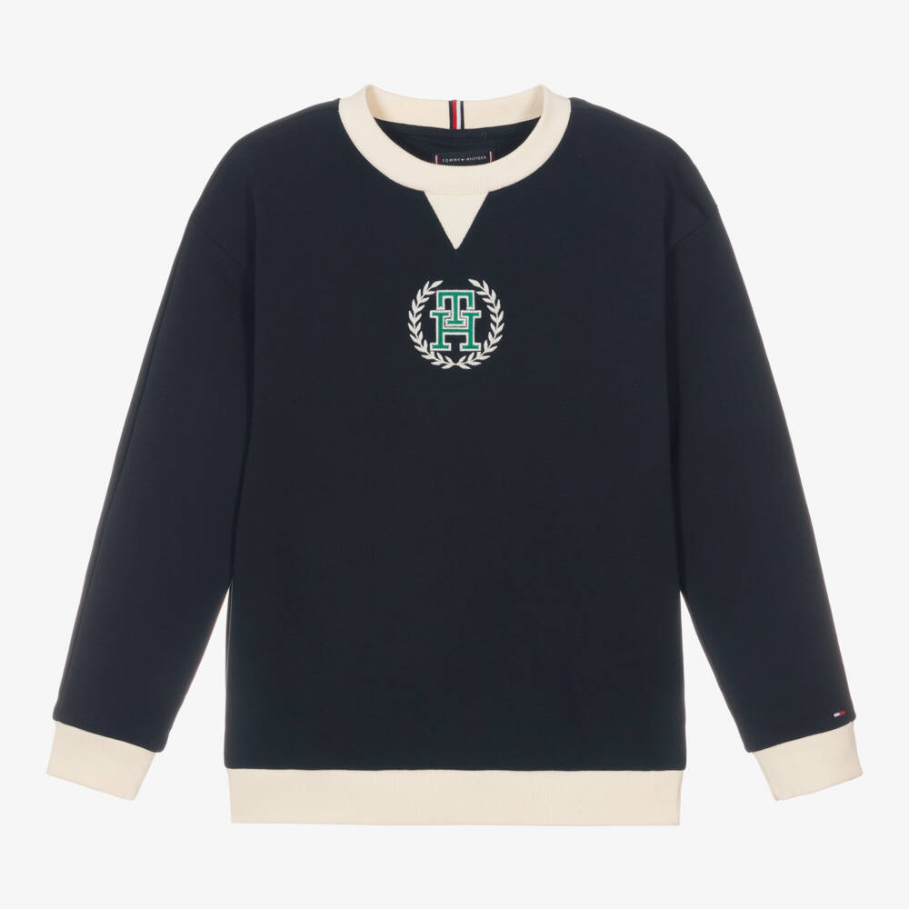 Inspired by the adult collection, this navy blue sweatshirt for teen boys is designed by Tommy Hilfiger. This long-sleeved top has an embroidered green TH monogram on the front surrounded by a symbolic laurel wreath design. It has dropped shoulder seams on the front, raglan seams on the back, and ribbed trims in a contrasting shade of ivory. The brand's iconic flag is embroidered on one cuff.