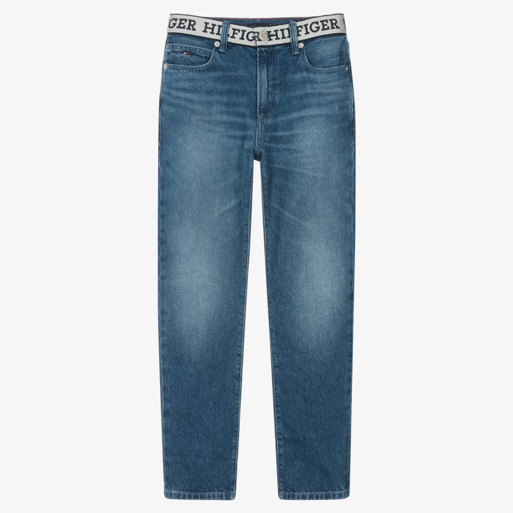 Teen boys denim jeans by American brand Tommy Hilfiger. With a washed finish, these straight leg jeans have white and navy blue grosgrain logo taping on the waistband for instant designer appeal. Five-pocket styling is enhanced with embroidered flag motifs on the front and back. They are made in soft, non-stretch cotton and fasten with an embossed button and zip. This product is made with at least 20% recycled cotton.