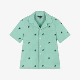 Ideal for warm, summery days, this blue and white striped cotton shirt for teen boys is by American designer Tommy Hilfiger. Cool and comfortable, it has short sleeves and is made in lightweight seersucker. For instant brand recognition, it has the signature red, white and blue flag logo embroidered on the chest pocket, a grosgrain logo tab on one side seam and logo button fastenings on the front.