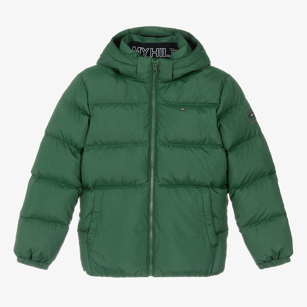 Green puffer jacket for teen boys by Tommy Hilfiger. A distinctive style from the American label, it has a woven logo patch on one sleeve, embroidered flag on the chest, and a branded zip on the front. The luxurious down padding, water-repellent finish and fleece-lined pockets ensure he will stay warm and dry in the colder months. With logo embroidery inside the neckline, the hood is removable, attaching with poppers, allowing him to switch up his look. This item contains at least 95% recycled fibres.