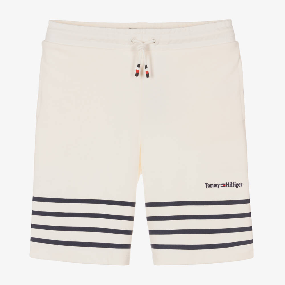 A pair of ivory shorts for teen boys from American label Tommy Hilfiger, made in stretchy, mid-weight cotton-mix jersey. These cool shorts are designed with navy blue nautical Breton stripe prints and the label's embroidered logo just above the hem. They have three handy pockets, with the iconic flag branding stitched on the back. Adjustable for a comfortable fit, the shorts have drawstrings with signature blue, white and red end caps on the elasticated waist.