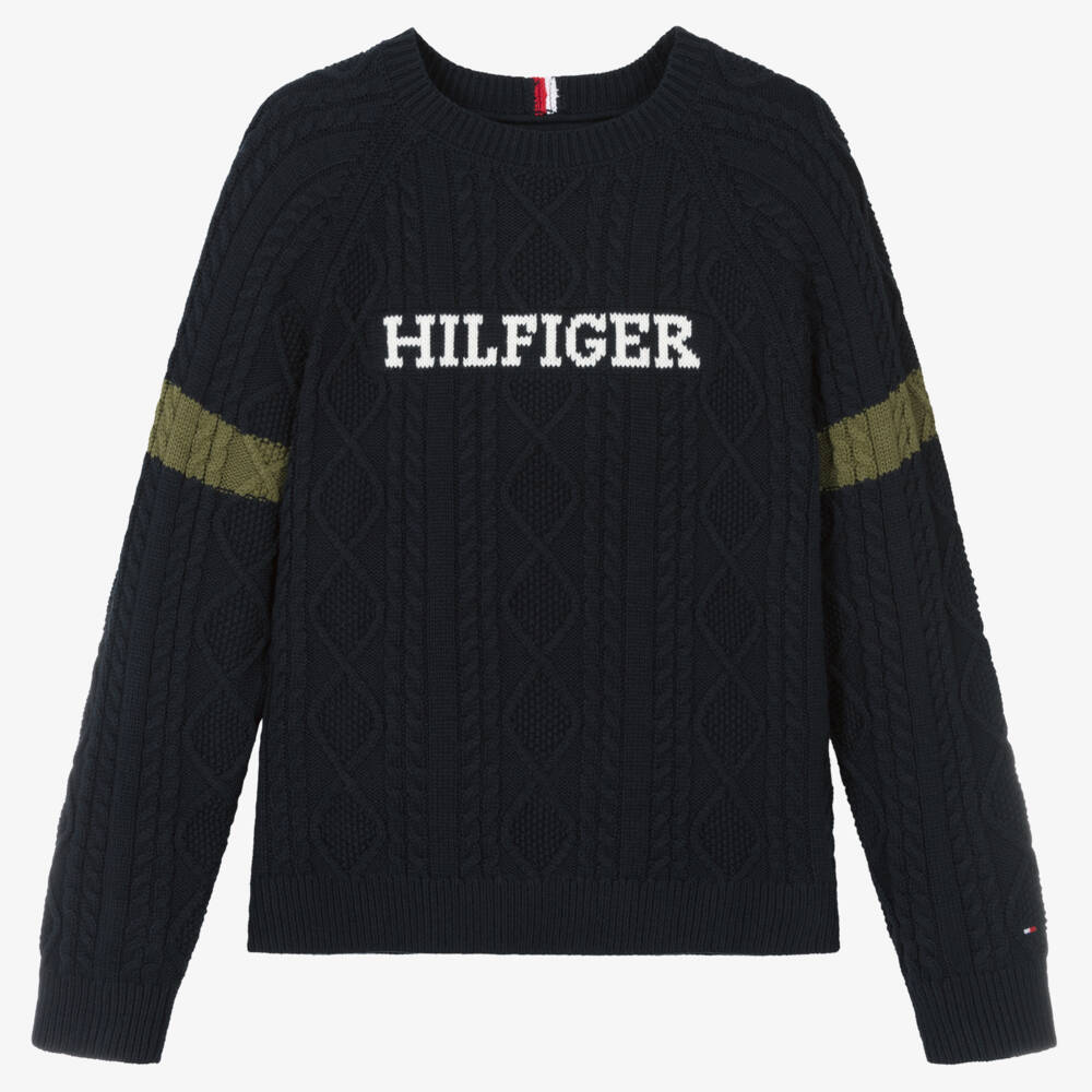 Preppy navy blue sweater for teen boys by Tommy Hilfiger. This soft cable knit jumper has a bold intarsia logo motif on the chest in a varsity-style. Distinctly designer, it has signature tricolour trims on the back of the neck and a flag embroidery on one sleeve. Khaki green stripes add sporty vibes to this wardrobe staple. This cotton-blend sweater is made using at least 50% organic cotton.