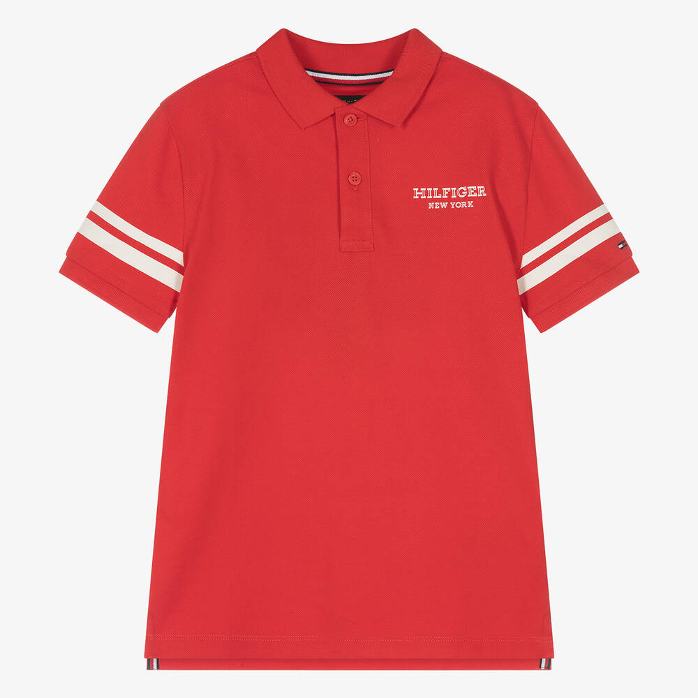 Smart-casual red polo shirt for teen boys by Tommy Hilfiger, with sporty white stripes on the short sleeves. Distinctively designer, it has a white logo print on the chest, an embroidered flag on one sleeve and branded button fastenings. Comfortable to wear, it is made in soft cotton piqué.