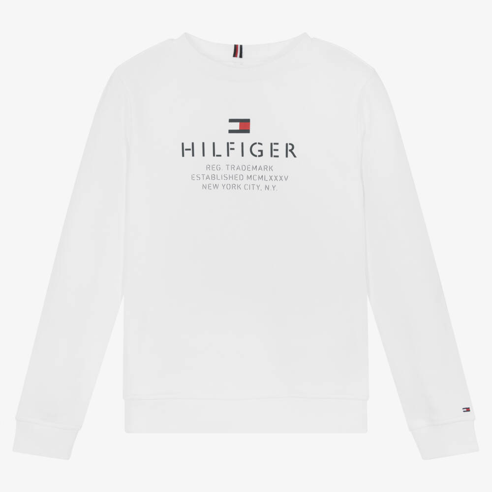 A white sweatshirt for teen boys from Tommy Hilfiger, printed with a distinctive navy blue logo graphic. Easy-to-wear and style, the signature flag logo is embroidered on the sleeve, with signature detailing on the neckline for added designer cool. This sweatshirt is made from a soft and comfortable cotton jersey, with a breathable looped underside.