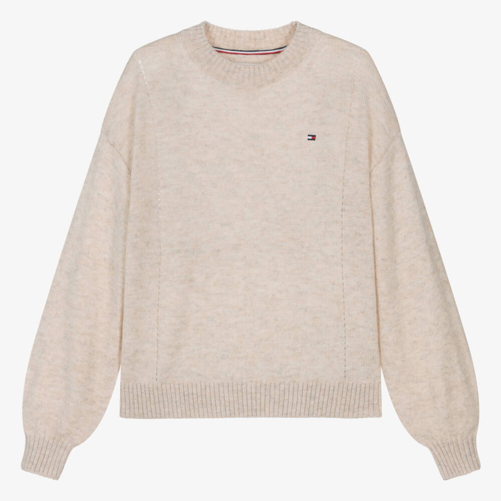 Designed by Tommy Hilfiger, this beige sweater for teen girls is embroidered with the tricolour flag logo for a signature look. This wardrobe staple is knitted in beautifully soft and lightweight wool with stylish patterned stripes on the front, combining comfort with classic styling.