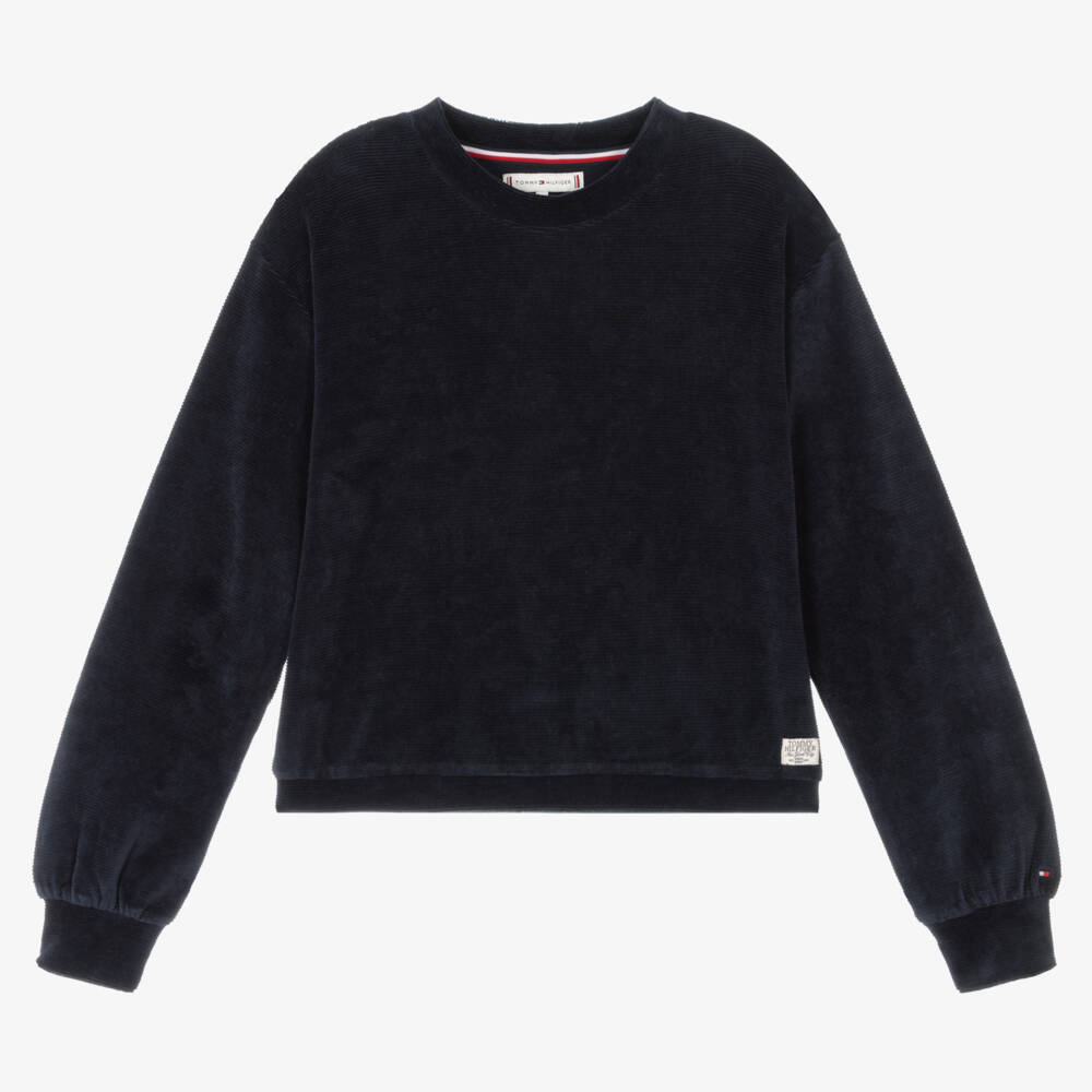 Navy blue ribbed velour sweatshirt for teen girls by Tommy Hilfiger. It is made in a super soft and comfortable cotton blend, with a waistband and cuffs to keep the warmth in. The American designer's branded logo patch is on one side, with the signature flag embroidered on one sleeve, above the cuff.