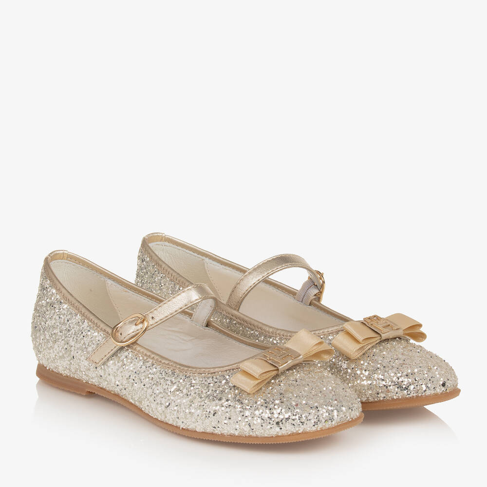 Sparkly and glittery, pale metallic gold ballerina pumps for teen girls by Tommy Hilfiger. Glamourous and eye-catching for a party, they have a satin bow with a gold-tone TH monogram charm decorating the front for an elegant branded touch. Made and lined in soft leather, they have an adjustable ankle strap fastening with a metal buckle over the foot. The leather insole is lightly cushioned for extra comfort and they have a non-slip rubber sole with a tiny heel.