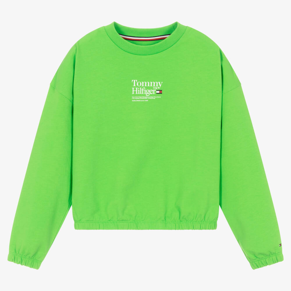 A bold green sweatshirt for teen girls by Tommy Hilfiger, with a cool graphic logo print on the chest. This logo-inspired top has an intricate flag logo embroidered on the sleeve for a recognisable look. Made from the softest cotton jersey, the elasticated trims form a casually relaxed fit.