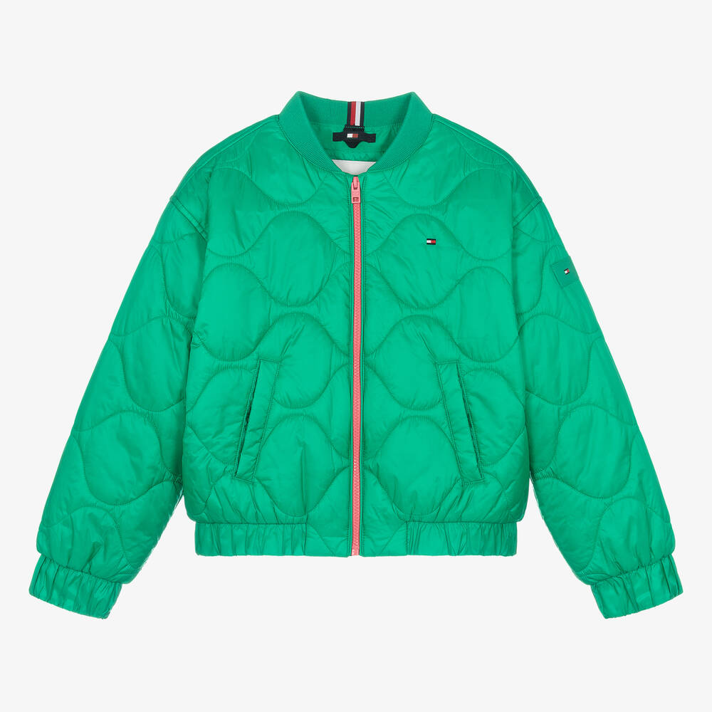 From American brand Tommy Hilfiger, a vibrant green quilted bomber jacket for teen girls, made in satin with a luxurious, silky feel. For a distinctive designer touch, the signature flag logo is embroidered on the chest and there is a logo patch on one sleeve. Lightly padded for warmth, the jacket has a classic ribbed collar, popper pockets and fastens with a pink branded zip for a contrasting pop of colour. This product is padded with at least 95% recycled polyester.
