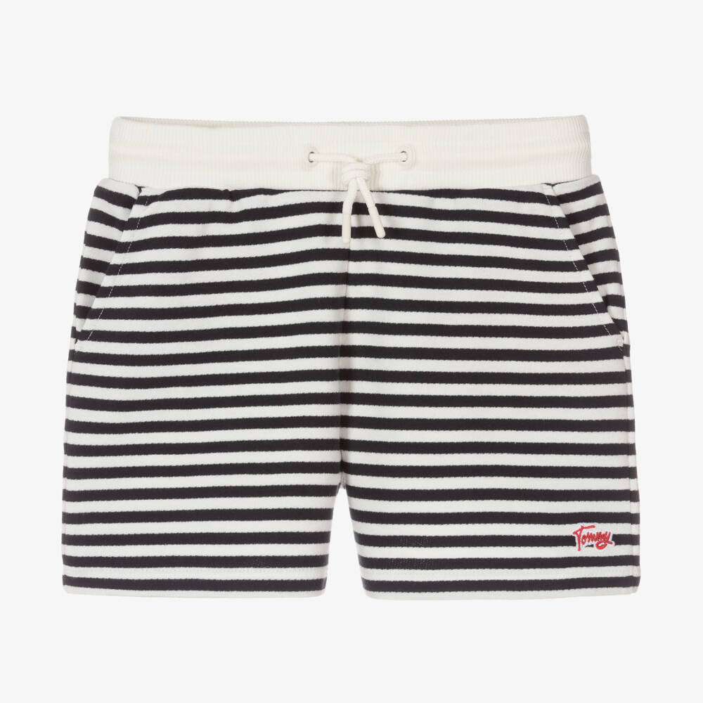Nautical inspired, ivory and navy blue striped shorts for teen girls are by Tommy Hilfiger. For an effortlessly laid-back look, they are made in soft and lightweight sweatshirt jersey with slanted front pockets and the American designer's name embroidered in red on one leg. The ivory ribbed waistband is fitted with a drawstring cord for an adjustable fit.