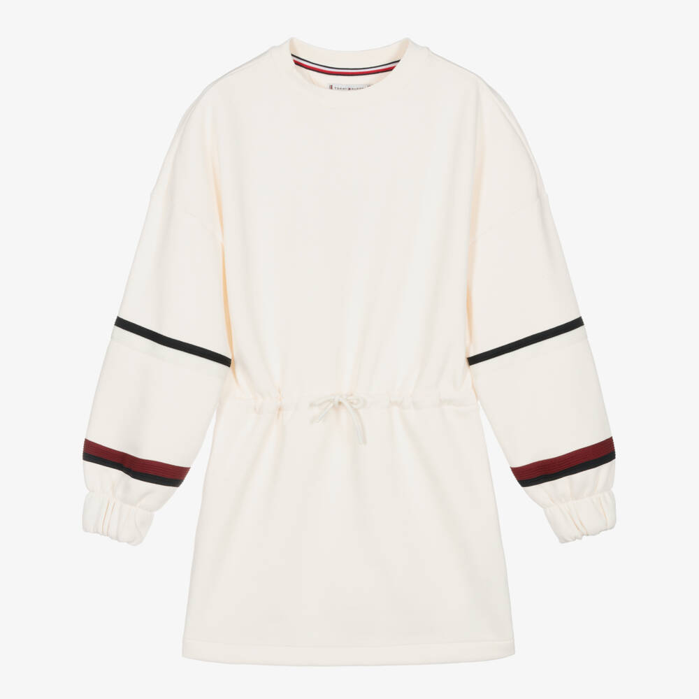 An ivory cotton sweatshirt dress for teen girls by Tommy Hilfiger, embroidered with the iconic flag logo on one sleeve. Sporty yet stylish, this jersey dress has navy blue and burgundy red stripes on the sleeves. The dropped sleeves and a drawstring waistband create a relaxed finish.