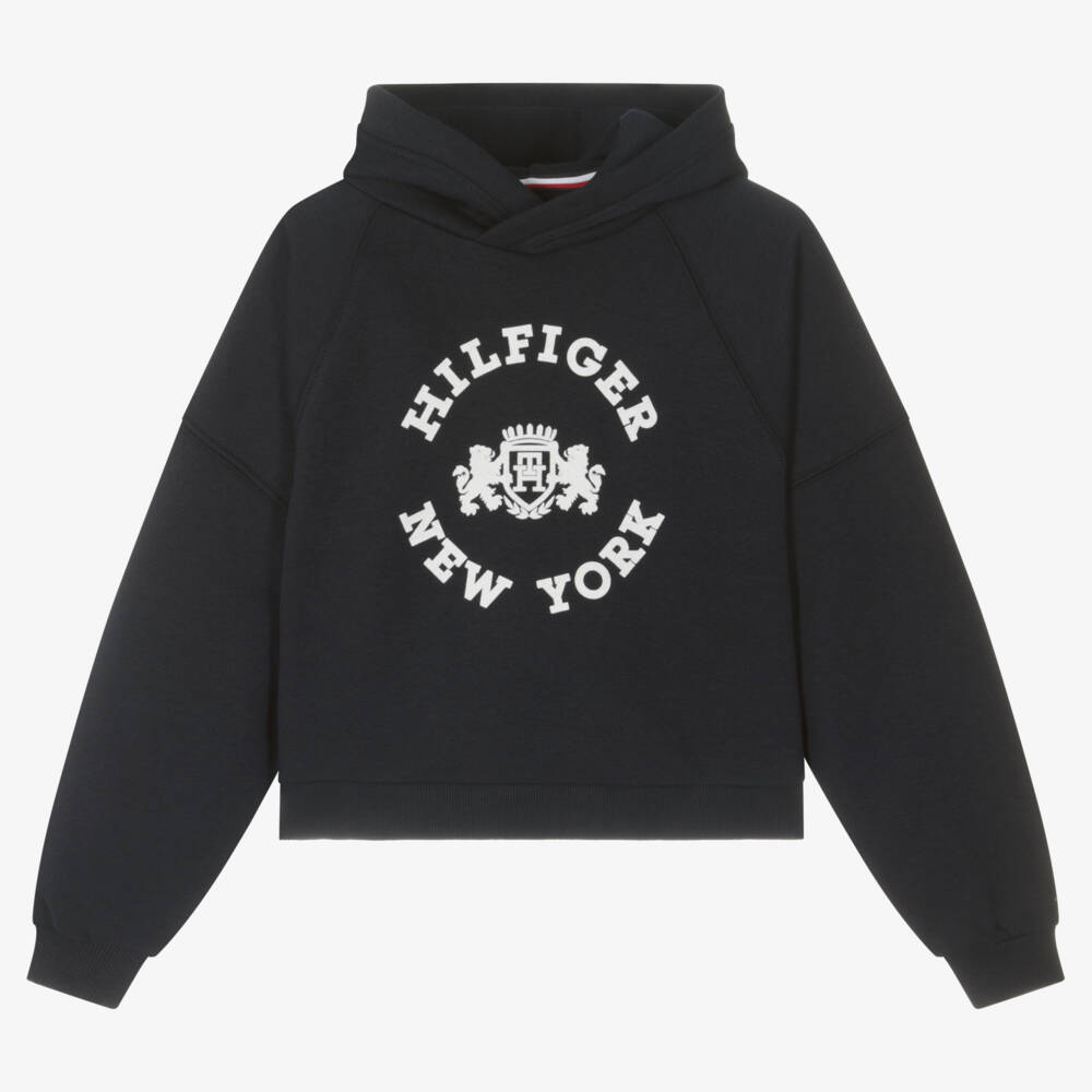 Navy blue hoodie for teen girls by American brand Tommy Hilfiger, with a white flocked varsity crest logo on the front. Designed in a relaxed boxy fit with raglan sleeves and ribbed trims, it is made in cosy cotton jersey with a soft fleecy inside. A signature flag logo is embroidered on one sleeve for an added designer touch.