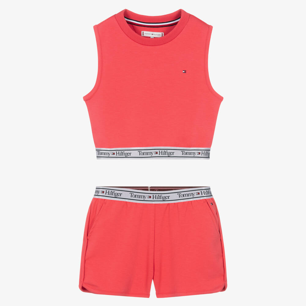 Pink shorts set for teen girls by American brand Tommy Hilfiger, with a sporty vibe. Made in a super soft, comfortable, viscose-blend jersey, both the cropped top and shorts have the signature flag logo embroidered on one side and elasticated logo trims. The top has a ribbed neckline and the shorts have jetted side pockets. This product is made with at least 50% FSC certified viscose.