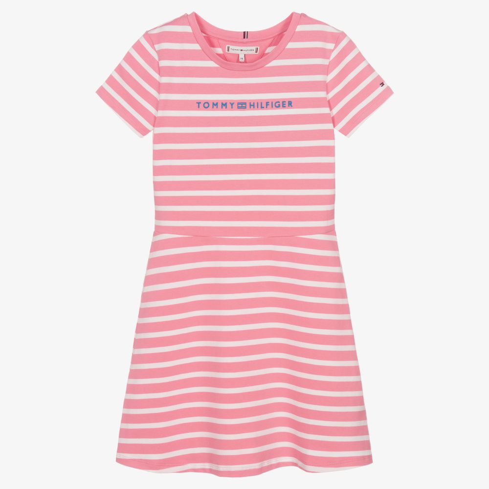 Pink and white striped skater dress for teen girls from Tommy Hilfiger, made in soft organic cotton jersey. The front has the brand's signature logo embroidered with a branded tab on the back of the crew neck. This casual dress is finished with an embroidered flag logo on one sleeve.