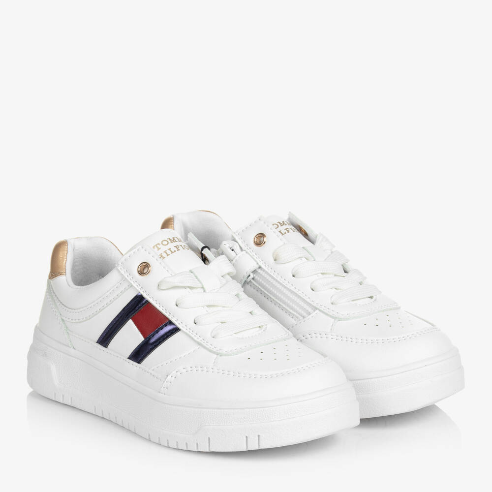 Stylish white faux leather trainers for teen girls, by Tommy Hilfiger, featuring the signature flag logo on the side for instant brand recognition. The sparkly metallic gold heel trim and logo print on the tongue add a glamorous designer touch. Comfortable to wear, they have a breathable textile lining, padded insoles and textured rubber non-slip outer soles for good grip. Made with at least 50% recycled polyester.