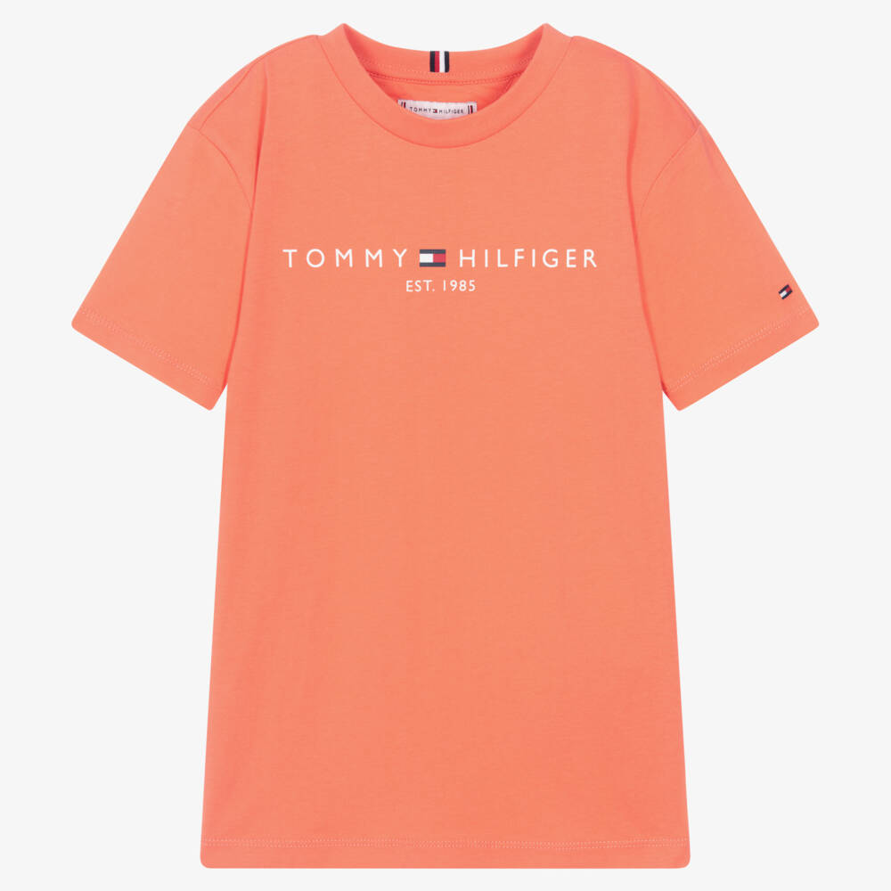 Orange T-shirt for teen boys and girls by American brand Tommy Hilfiger. Printed on the front is the designer's white logo and signature flag logo, with another flag logo embroidered on one sleeve. Around the back of the neck is a grosgrain tab in the brand's colours of blue, white and red. Ideal for relaxed days, it is made in comfortable jersey.