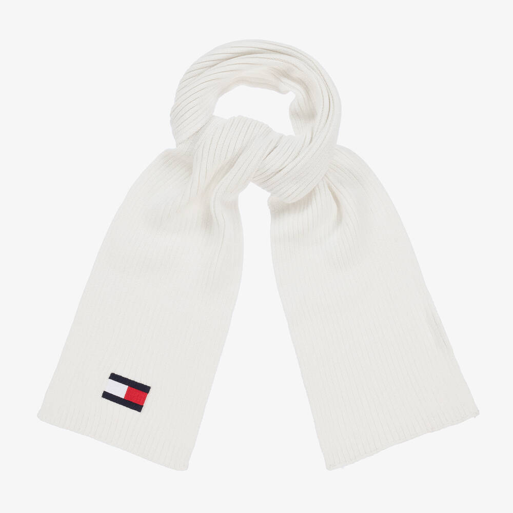Off-white scarf for boys and girls by Tommy Hilfiger, made in a soft, ribbed cotton blend knit. Ideal for those colder days, this cosy scarf has the brand's iconic flag logo appliqué on one end for a distinctive designer look. This product is made with at least 50% organic cotton.
