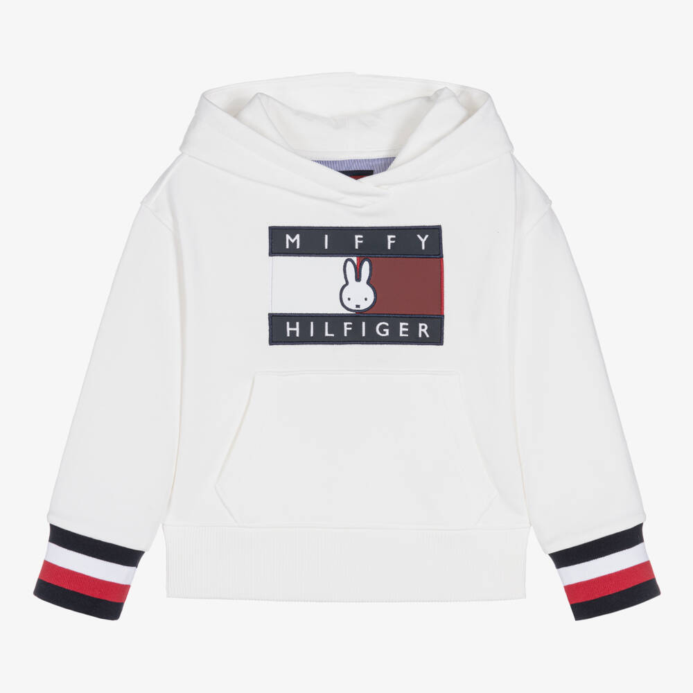 White hooded cotton sweatshirt for boys and girls by American brand Tommy Hilfiger, inspired by the adult collection. In collaboration with Miffy, it has the designer's iconic flag logo and Miffy appliqué on the front. Just right for relaxed days, it is made in comfortable jersey with cosy ribbed trims in the signature colours of red, white and navy blue and a useful pouch pocket on the front. The cotton in this product is at least 50% organic.