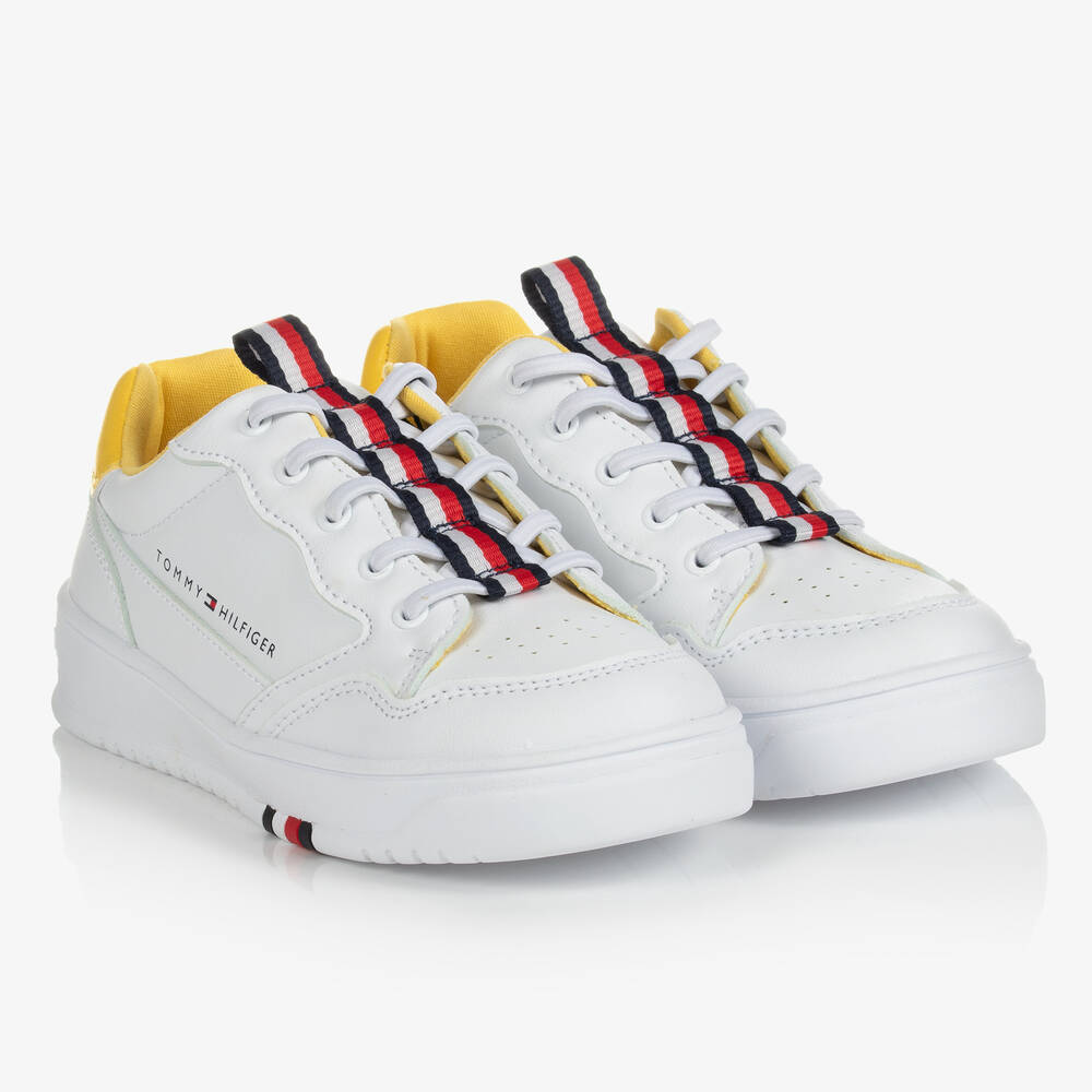 Funky white faux leather trainers for boys and girls by Tommy Hilfiger. They have an eye-catching yellow trim on the heel and the brand's signature stripes of red, white, and blue up the center of the elasticated laces for a designer touch. The non-slip rubber outer soles are textured for improved grip on wet or slippery surfaces. The polyester in this product is at least 50% recycled.