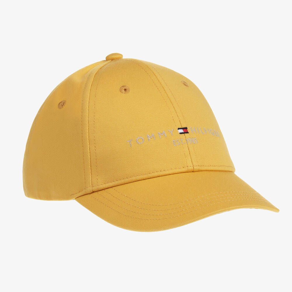 Mustard yellow Tommy Hilfiger cap for boys and girls, made in mid-weight organic cotton twill. With an adjustable snap fastening on the back, this classic six panel style has a white embroidered logo design on the front.