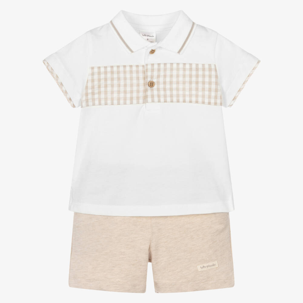 Beige and ivory shorts set for baby boys by Tutto Piccolo, made in soft cotton jersey. This casual outfit set includes a short-sleeved polo shirt with button detailing and a gingham check panel across the chest. The paired shorts have a marled tone and an elasticated waist for ease of movement.