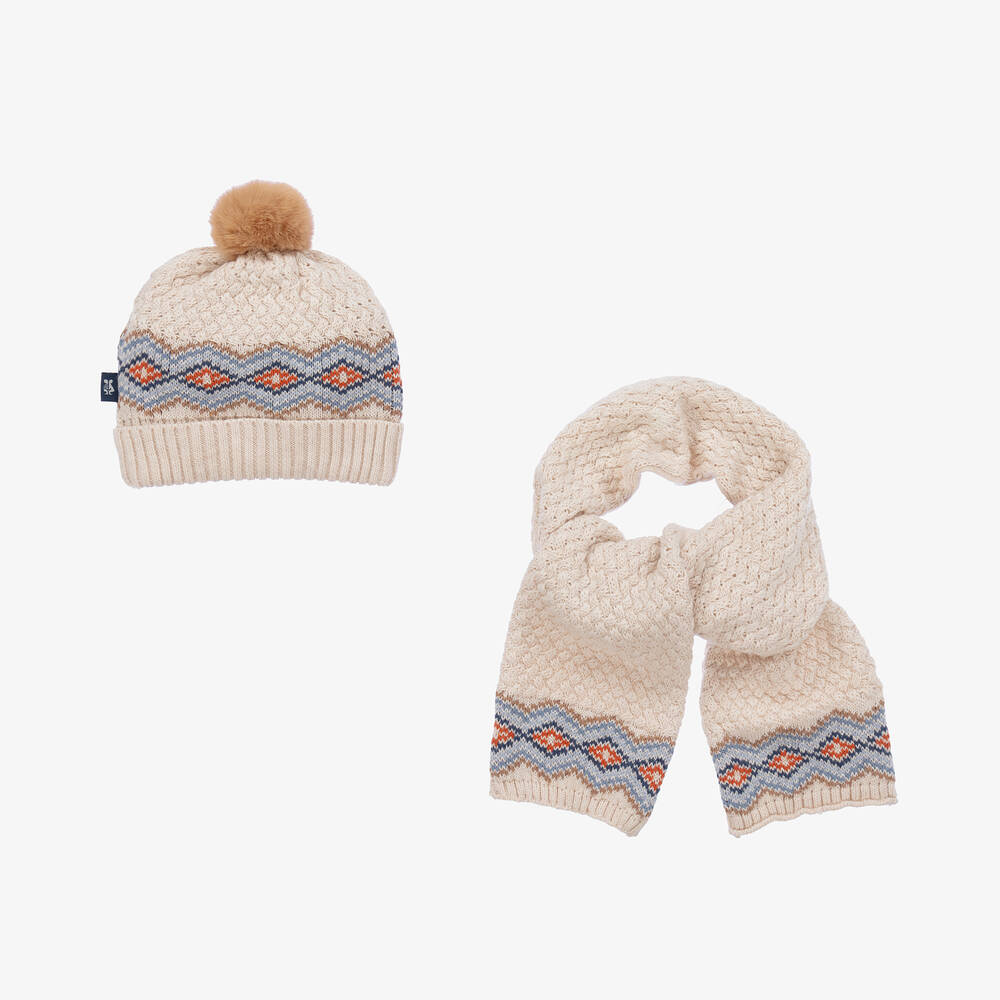 Lovely and cosy in a soft cotton blend knit, this light beige hat and scarf set for boys and girls is by Tutto Piccolo. In a basket-weave pattern, the matching pieces are trimmed in a beige, blue and orange diamond Fair Isle pattern. The beanie hat has a ribbed turn-up brim and a cute beige faux fur pom-pom on the top whilst the scarf is made in a double layer for extra warmth.